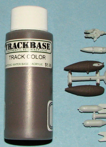 Trackbase offers a track color acrylic paint in what looks to be full ounce bottles for $5.95 a bottle. The paint is a dark brownish shade and once shaken up, it is pretty thick. I gave it a try on some plastic drop tanks I had and the coverage of the paint is very good. The bottle recommends a primer under it and I can see why as without it, it can be rather easily scratched as you can see.