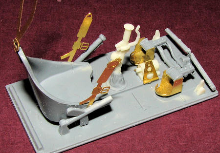 A most complete cockpit is provided with the majority of resin and photo etch bits being used there. The instrument panel has nicely done instrument detail. Having a decal as an option would have been nice two. There are two sidewalls on which one can put a number of components as well. There is a photo etch harness set to add to the seat. For the engine, we have a resin engine face and resin exhaust to put on the inside of the cowling.