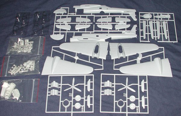 Upon opening the box, one is greeted by a mass of multi-media bits and pieces. Starting with the easy stuff, there are two sets of vacuformed canopies/turrets, each a bit different. Good thing, too as some of the clear bits were a tad deformed and unfortunately, both of my turret bits were creased, mostly because the plastic on the top is very thin. Next is a bag with two engines in it. Each R-1830 engine is built as a kit in itself and consists of a superbly detailed resin block with separate metal cylinders. The sprue for the cylinders has "front" or "rear" on it so you won't get them in backwards! Next is a bag of resin containing the two wheel wells, two seats and the bombardier's aft bulkhead. Again, the resin is superbly done.
