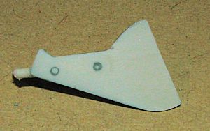 All of the control surfaces are separate and some are thicker than the surface to which they are to be attached. There are large slots on the underside of the wings for a variety of items. Either two fuel tanks (with pylons molded onto them), two 'bombs', or a set of very clunky rocket rails with eight rocket shapes.