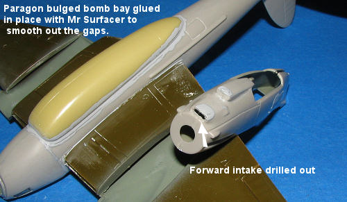 I also took this opportunity to attached Paragon bulged bomb bay. It has a large resin pour stub on the front of it that requires quite a bit of cleanup to get right. I wrapped a piece of rough grit sandpaper around the fuselage in order to get the final shape about right. I'm not really sure just how tight a fit this bomb bay was as none of my references are detailed in that area. I couple of applications of Mr. Surfacer 500 was made to fill in most of the gap.