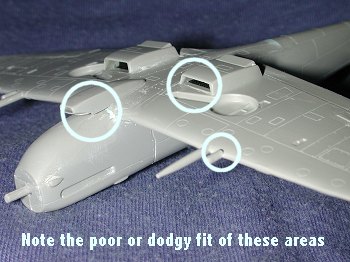 The interior parts fit each other fairly well and make into a nicely done interior. That was until I tried to fit it into the fuselage halves. I first glued the fuselage halves together. Thanks to the thin plastic, this wasn't as simple a task as you might think. The entire forward engine cowling is a separate piece (undoubtedly to allow different variants from a single mold) and so the fuselage halves are quite flexible. Once the fuselage was glued, I inserted the interior from underneath. Fit here is not at all good and I had to do a lot of fiddling around to get things to fit in a reasonable manner. The kit offers the option of having the small door open, but I glued it in place, realizing that I didn't want the poor fitting cockpit to be easily seen. Not really a problem as I later came to discover.