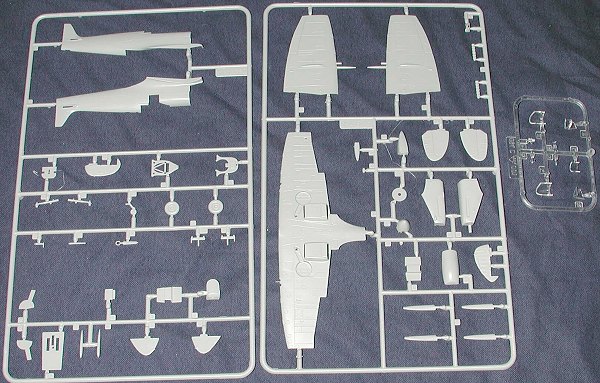 The kit has a fairly complete interior with no side panel detailing. Wheel wells have convincing detail in them though seem a tad shallow. Not really a problem as there is no option to build this kit with gear up. There are the following optional bits: Peaked rudder, large and small oil cooler intake, regular and clipped wing tips. For some odd reason, the engine section is separate from the rest of the fuselage. Perhaps for later versions as the sprue for the fuselage has all the bits that would be the same regardless of what Spit version you would be building.