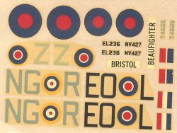 Decals are for three aircraft. One is a Mk I night fighter from 604 Squadron in 1940-41. It is in overall black. Next is a desert camo Mk VI from 227 Sq at Malta in 1942. Finally a coastal command TF.X from 235 squadron in the usual sea colors. Of course, the decals have yellowed quite a bit in the last 30 plus years, but there are several aftermarket sheets for this plane and if you must use the kit decals, a session in the sunlight should bleach out much of that yellow.