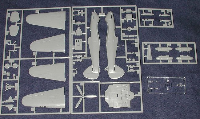 Just looking at the kit, one realized that this has been designed to do several variants. By having the wings designed the way it is, you can see that there either is or will be an early Hurricane I with full fabric wings. The ones with this kit are the 12-gun wings. Parts are well detailed with no sink marks that I could find on initial inspection. There is some flash on a few of the parts, but nothing major at all. The rear fuselage fabric seems well done. I know that the Hasegawa kit has been lambasted for over-accentuating this area, but as I have not yet seen this kit, I'll hold off any comments. It looks nice to me. For options, you have a choice of things under wings; drop tanks or bombs, and a choice of circular or fishtailed exhaust.