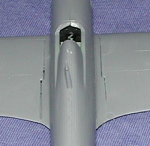 Moving back to the top, the cockpit bulkhead was painted RAF Interior Green using ModelMaster paint. Then the windscreen was glued in place followed by the canopy. No real traumas here. The hood was glued shut as there is really little to see inside. It was then masked in preparation for painting. During this operation, I managed to break off one of the 20mm gun barrels. Typical!!