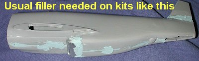 Once the fuselage was pretty well smooth, I then attached the nose. Despite my care in ensuring that it would fit, it didn't quite match up. Not a problem as I have plenty of filler. While I'm talking filler, I should point out a couple of things. First of all, I use 3M Acryl Blue filler as I've found it to be better than most of what is around. I also use super glue as a filler. You see, almost all of your fillers will shrink; it is the nature of the beast. Unless you use a two part epoxy filler, which most of us don't. I also use superglue as it won't shrink, but I've not found it to be very useful for filling large areas. The key is to use them both and in that way, you get the benefit of both products. Truly, if one has a lot of seams to fill, the epoxy fillers are really the best, but since they have to be mixed, most of us are too lazy and don't use them that much.