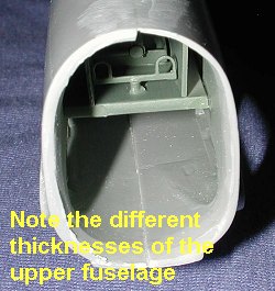 At this time, I now had the main subassemblies done. I then started to fit those to the fuselage to see if any work needed done. Boy, did it. It seems as if the fuselage halves are about a 1/16 to 1/8 inch too wide. I got to work sanding down the mating surfaces. I should point out that one fuselage half was short shot on the underside so there will be a rather prominent gap to later fill. The parts that needed to fit were the nose, the canopy, the fin and the underside air scoop. I also found that the inside of the fuselage where the instrument panel/anti-glare shield was to fit was too thick. Grabbing my Dremel tool, I ground away and did much test fitting until this component fit properly. All of this took me about a week. Again, I'm not a fast builder and will work on something for a while and then go do something else (like write reviews) or move to another kit that is in work.