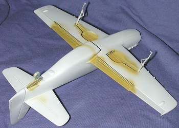 I also need to mention that there was almost no part of the kit where filler wasn't needed. The only real exception to that was the contra-rotating prop. The metal parts in this kit are superb and fit with minimal clean-up. Anyway, after several hours of clean-up over a few days time (I'm not a 'sit down and do everything at once' type of builder), I started with some subassemblies. The first of these were the wings. Now the plastic on this kit is quite thick, but also quite soft. I use a 'hot' glue (one that melts the plastic and is rather quick drying) and on the wings, I had little trouble getting the parts to glue once the mating surfaces were sanded. I did have to file out the area around the gun nubs on the wing to get a good fit there. The leading edge required several filler applications.