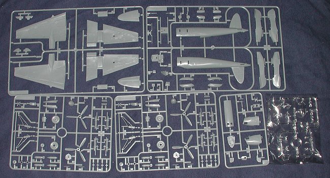 This particular kit does the bomber and photo recon versions, the B.IV and PR.IV. The biggest change from the Mk VI is the bomber nose and a new set of bomb bay doors with camera holes in it. The lower right hand sprue and clear bits are all that are different from the earlier variant. Tamiya provides two different props, shrouds for the exhaust and different wheel inserts for the different versions. For this kit there are underwing rocket and bombs that are not used. The same can be said for the underwing long-range tanks that are not used on this kit, but were used on other versions of the Mosquito. To my knowledge, these underwing tanks are not even offered as options with the Hasegawa kit.