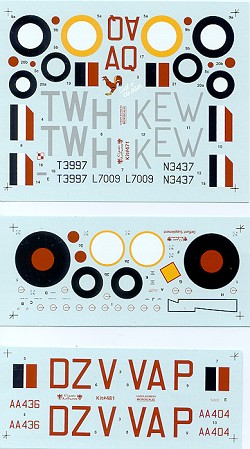 Decals are superbly printed by Microscale so you know that the quality is there. For the Mk.I, all aircraft are in a disruptive camouflage scheme. The aircraft of 141 Sq and 307 Sq are in Dark Green/Dark Earth uppers. The 141 Sq plane (the one on the box art) has a Sky underside. The 307 Sq aircraft has the left underside in black and the right in white. The third Mk.I is from 276 (ASR) Sq and in FAA colors of Extra Dark Sea Grey/Dark Slate Grey over Sky. For the Mk.II nightfighter, both are in matte black overall. The units on the sheet are 125 Sq (the box art plane) and a very similar151 Sq aircraft. You are provided with two sheets per kit. One is a generic roundel/data sheet with the specific unit markings and alternate roundels on the separate kit sheet. The generic sheet is the one in the middle with the Mk.I atop and the Mk.II on the bottom.