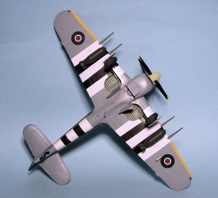After trapping the radiator exhaust door in the fuselage halves, the area was cemented. I then attached the rudder and tailplanes before gluing on the lower wing. There is a light that fits in the lower wing so don't forget that feature. The kit can be built to either carry rockets or bombs. You could probably do both, but you'd have to forego the inner two rocket rails in order to clear the bomb. I chose the bomb version as that is what the decal sheet indicated.