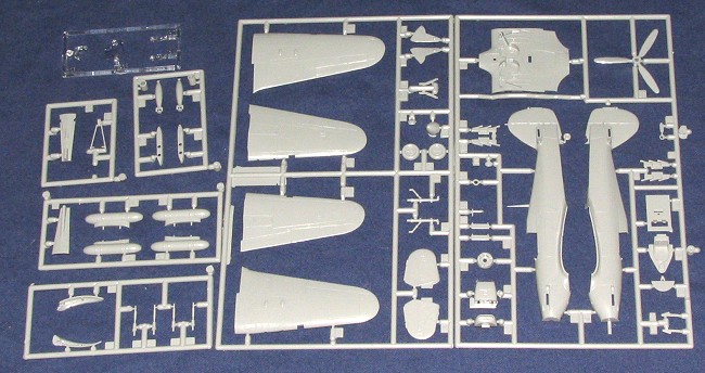 Molded in the usual light grey plastic, my kit was showing some of the rigors of many moldings as there was some flash on a few parts and considerable on a few more. You get two major sprues and five smaller ones. These smaller ones contain the clear bits, bomb racks, drop tanks, tropical filter and the 'hooked' part of the aft fuselage that makes this a Sea Hurricane.