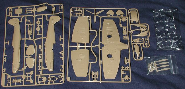 This particular kit has some of the parts in common with the earlier Spitfire I kit reviewed here some years back, specifically the one with the main airframe. It includes a new wing sprue, a smaller one with the various filters, ferry tank, and a pilot in tropical garb. There is also a four bladed prop and spinner included, though I'm not really sure just what that is for as none of the schemes use it and I don't think the MkV ever used this kind of prop. It is also molded in a nice 'desert tan' color. (I've been told that it is an MDC prop for making a Seafire III. One of the benefits of buying kits at swap meets! ed)
