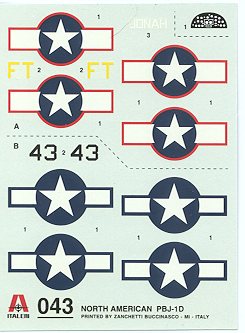 The kit instructions are very good and give color callouts using Model Master paints. These PBJs are shown as being sea blue over white, but I think they were painted in the tri-color scheme of dark sea blue, medium blue and off-white. When building this kit, I'd recommend doing research into that area. The markings are for two aircraft. One is a flight test aircraft with the red surround insignia. The other from VMB-413 in the Southwest Pacific. Both are circa 1944. The decals look a bit suspicious in terms of the national insignia. Not sure exactly what it is, but they just don't look right to me and I'd be tempted to replace them when building the kit.