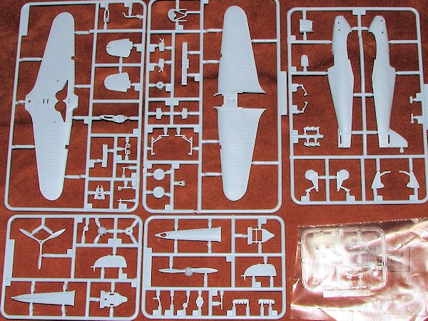 Humbrol has done its homework on this one and just from the feel of the instructions, I'd say that if you've built the 1/48 Classic Airframes kit, you'll see a lot of similarities. As a start, The upper and lower wing halves are a single piece, so no worries on wing root issues. The wheel wells are several sections that fit into the lower wing. Atop the upper wing, the interior is fit. There are two sprues in the kit that include both early and late bits. For both of the markings options, one uses the early piece that fits behind the seat. This is without the extensive armor plating. The interior floor includes a control column and rudder pedals. This then fits into the fuselage halves and in turn, this fits atop the wings.