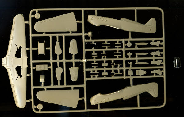 Apparently this sprue is used for the later version as well as there are two sets of gear doors provided, about the only external difference between the two types. There are wheel well sections that are cemented into the lower wing. Cockpit is the usual flat floor plate with separate seat, instrument panel, rear bulkhead, stick. There is nice framework and box detail on the inside of the fuselage halves. The prop has separate blades with only depressions on the hub to show where the blades go. Those will need to be drilled out. The kit also requires the builder to stretch some sprue for a few minor items.