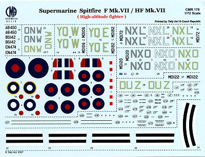 Instructions are like a little reference book in that there are no fewer than seven full pages of well done b&w photos of the lone extant Spit VII. Markings are included for nine aircraft, which has to be a record for this type. There are all possible camo options for the Spit VII and the decal sheet provides several optional code options for aircraft as it was not always know exactly what colors they were. The Tally-Ho printed sheet is very well done and should be a pleasure to use. A full set of stencils is also part of the set.