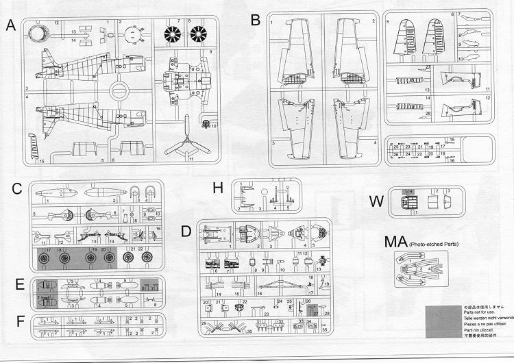 First of all, the parts are superbly molded with outstanding engraved detail. One gets a fully detailed cockpit that rivals many larger scale kits and includes sidewall pieces. It is here that the only etched bits in the kit are used; the pilot harness. The kit provides a full engine with mounts and an accessory section. The major advantage of this kit to others is that it can be built with the wings folded. No need to go aftermarket with this one. It also includes a bevy of under wing ordnance options. However, being a night fighter, I'm not really sure any of them would be appropriate aside from the centerline fuel tank. But in case you want to do a standard F6F-5, you do have bombs and rockets, for which you'll have to open the appropriate holes in the lower wing sections. At least for the rockets as the bomb pylon holes are already drilled so you may want to fill those.