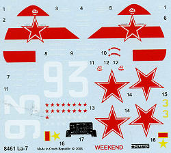 Instructions are well illustrated on a single folded sheet. All color data is with Gunze paints, a bit of a bummer for Americans now that this paint is no longer being imported. Fortunately, the AMT colors are provided in some cases so you can use alternate paints. The decal markings option is for the very late war aircraft of Col. S.F. Dolgushin, commander of the 156 GIAP. This plane has a full red nose and a red/white striped fin/rudder. This plane has no upper wing insignia and is AMT-11 grey upper with AMT-7 undersides, so no fancy camouflage scheme. Decals are well printed and include a decal for the instruments.
