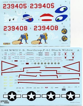 Options are for two planes, one is the box art plane "Lady in the Dark" which is unofficially credited for the last aerial victory of WWII. The other is an equally all black P-61B "Anonymous II/The Spook". Both are from the 548 NFS based on Iwo Jima in the last months of the war. Instructions are quite well done with color information provided using Gunze and Vallejo paint references. The decals are also nicely printed and should provide no issues. I built the initial boxing and found it to be an excellent kit. It will take careful building thanks to the large number of parts, but it is well worth it.