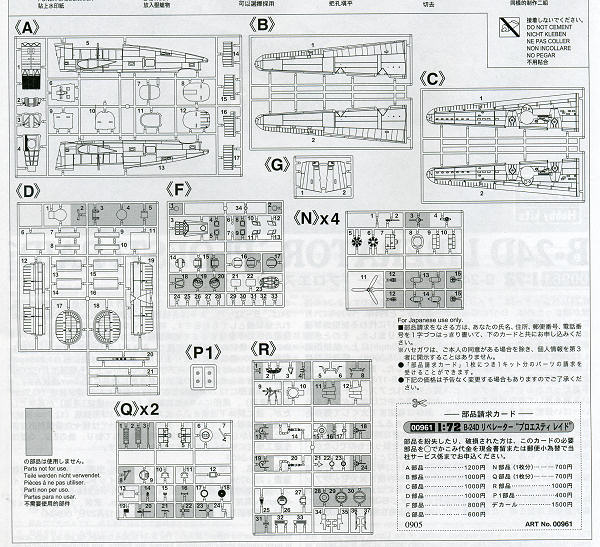 Due to the number of sprues and the size of the parts, I thought a scan of the parts trees from the instruction sheet would be more useful. Hasegawa mold quality has been high for 20 plus years and I see no change in that on this kit. The vast majority of this kit will be the same from variant to variant. That will include the wings, tail planes, most of the fuselage, bomb bad detail and so on. The B-24 was a very tail heavy plane in service, needing concrete blocks to hold it on the nose wheel if more than one engine was removed for servicing or replacement. This kit will be no different, though there is not much room far forward to place weight.