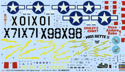Instructions are typical Hasegawa in that they are superbly done with Gunze paint references. The huge decal sheet is so large that it was a tiny bit too big to completely fit on the platen of my scanner. All three options are for, of course, the 79th FG. All are unpainted metal with OD anti-glare panesl and all have blue tails, though two of them are a lighter blue than the box art plane. Speaking of which, that one is for the HQ flight of the 79t and has alternating red cowl flaps and a very nice nose art. Next is 'Dove Andare Babe/Kooleys Komet' with the 87th FS and coded X71. The third option is X98, also with the 87th FS and named Miss Bette II. The fin lighting bolts are different on each aircraft so that is why there are three options provided. The decal sheet looks to be an in-house printing and is very nicely done.