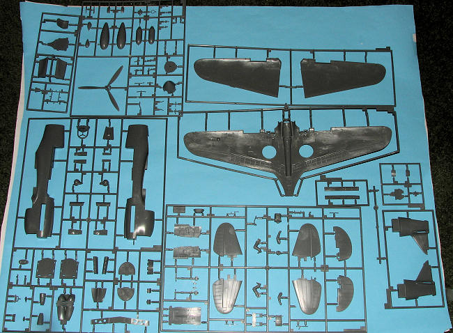 First off, it is quite obvious that the whole gamut of later P-40s is in the works. The parts layout has a separate tail/fin, inserts for the forward cowling cooling gills, inserts for the various exhaust sections, an opening for the later 'N' style greenhouse aft section, a separate sprue for the 'big wheel' P-40E-K versions, and so on.