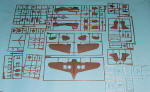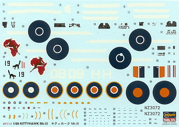 Markings are for two planes. One is the P-40M version as shown on the box art for Geoff Fiskin of the RNZAF in mid 1943. All the white stripes are part of the sheet as are the correctly colored roundels. the aircraft is in OD over Neutral Grey according to the instructions. The other is for a P-40K of DB Hauptfleisch of 2 Sq SAAF in North Africa during 1942. This one is in the desert scheme of Dark Earth/Middlestone over Azure Blue with the required Red spinner. The decals are quite well done and seem to be the proper colors. They also seem a tad thicker than aftermarket, but should work well. You get bomb stripes as well as those for the instrument panels.