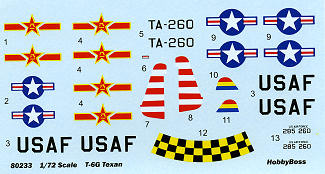 The instructions are quite basic, but then, so is the kit. Gunze paint references are used and the colorful decals are for two planes. One is a Korean war plane from the 6147 TCS in 1952. The other is a Chinese PLAAF plane that was undoubtedly taken over from the Nationalist Chinese when they departed the mainland. Both schemes are shown in color on the back of the instruction sheet. Both are unpainted metal with black or olive drab anti-glare panels. The wing bands on the USAF plane will need to be painted. Decals are quite well printed and should provide no surprises. As I've mentioned, I've found Hobby Boss decals to be very good.