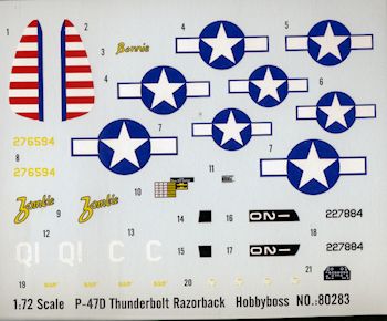 The kit comes with the DF antenna which is not appropriate for the box art plane as this feature was generally only used in the Pacific. I should also point out that according to the serial numbers on the planes, both of these are P-47D-23-RA aircraft and not the D-20-RE as mentioned in the instructions. These planes both had Curtiss-Electric props and not the Hamilton Standard that is supplied in the kit. It would have been nice if both were included, but for those who want to have an accurate aircraft using the kit decals a replacement prop will have to be found.
