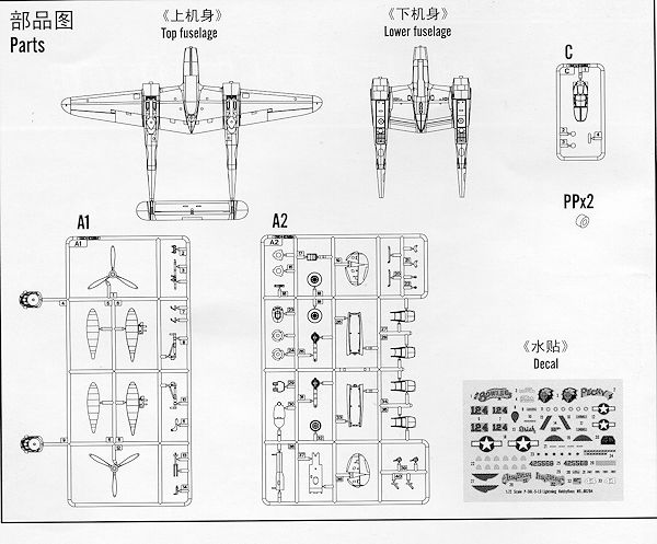 Landing gear both fore and aft have separate wheels, oleo scissors and retraction struts. The main gear doors, often an issue on P-38s, are a single construct along with the main gear wells. Boom intakes are separate as are the fin sections. Turbocharger bits are also separate and the kit provides a one piece canopy. For things under wings you have a pair of drop tanks. The nose is separate as are the forward engine nacelles. It is here that one will load in the 6 grams of weight to keep it on its main gear. This is actually a goodly amount of weight for a kit of this size, but there is room.