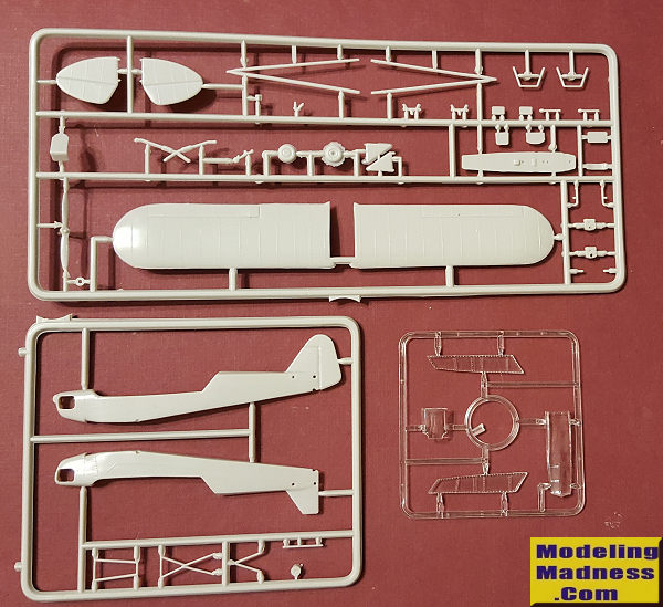 Two grey sprues and one clear don't take up a lot of room in a fairly small box. The actual construction seems pretty straight forward, though there are small parts. No interior sidewall detail, though there is the very prominent upper interior framework provided. The back seat is little more than a pad on the floor with a strap for a seat back.
