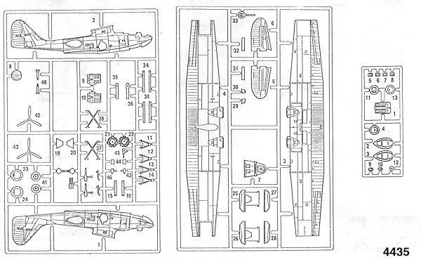 The cockpit has molded in setas and includes the mount for the nose turret. Two control sticks are provided and that is about it. Wheel wells for the main gear are also separate while the nose gear plugs into a hole in the bottom of the cockpit. One can also build the kit with the floats raised, this option only being needed for an in-flight display. Engines are generic but good enough for the scale and fit into one-piece cowlings. Cockpit and side clear bits are fairly nicely done and will require some careful masking as there are a lot of small panes.