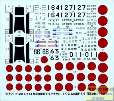 The instruction sheet is large and includes sections in English. There are five well drawn construction steps that show the various options. The other side of the sheet is devoted to markings and painting. There are seven options, all Japanese and while I have titled this preview 'JASDF' some of these may be Navy. All save one option is in overall trainer yellow while that lone options is in unpainted metal. Typical of Platz, the decal sheet is very comprehensive, offering even the black anti-glare panels and the wing walk areas. They also include roundels for all seven options, even though you can only build two from the kit.