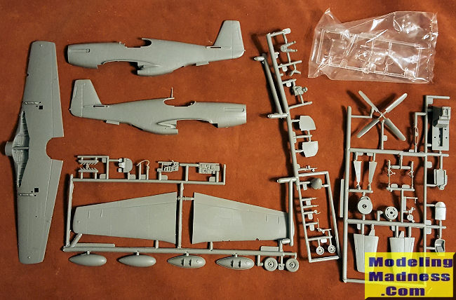 Wings are a single lower section with two upper halves. Landing gear is nicely done and again, may be something you want to leave off until after painting. Like most Mustangs, the lip to the radiator duct is separate. Inner gear doors include retraction struts which is nice. Tail planes are separate moldings.