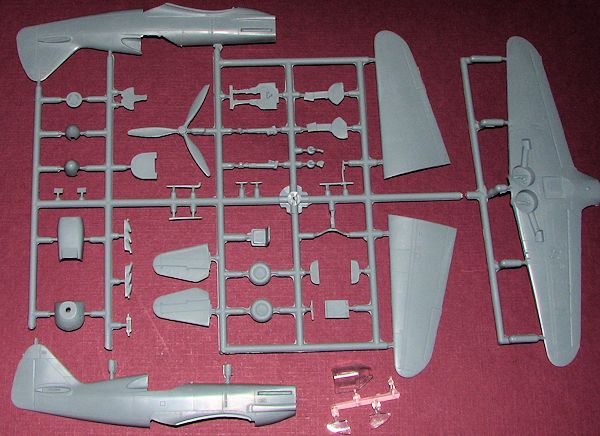 The fuselage haves have nice sidewall detail, something the older kits are lacking. There is the standard interior, made of a floor, bulkheads, seat and control stick eith the instrument panel fitting to one fuselage half. The nose of the fuselage is a single piece so no upper and lower seam to fill. Wheel wells are molded into the lower wing half and have acceptable detail. Landing gear are fairly well molded and will look the part when done. The main gear doors are molded as a single piece so the builder will not have to layer the outer doors. Inner doors are separate. Wheels are a single piece. The radiator bath is separate and has a blocking plate. The kit offers both short and long prop spinner but does not tell you which is used with which markings option. Nor can you tell from looking at the painting diagram.