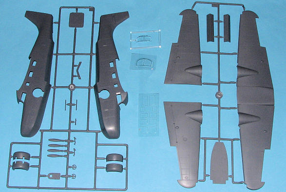 There are fuselage halves, upper and lower wings, engine cowlings, props,