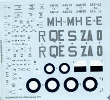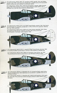 Markings are for four aircraft, all with a base of Foliage Green over Sky Blue. The initial aircraft was used as an interceptor in August 1945 with 83 squadron so was highly polished for additional speed. The other three options have a variegated Earth Brown pattern over the Green. The white tailed version is with 8 Squadron in New Guinea in 1943, Next is a 4 Squadron plane, also in New Guine during 1943, but before the white tail/leading edge requirements. Finally, an 84 Squadron plane based at Perth in 1943. This one is named 'Sleepytime Gal'. Decals are well printed and past experience shows them to be very thin.