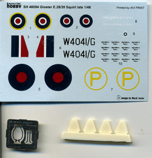 The instructions have but four main steps with various smaller drawings to assist with alignment and parts placement. There are markings for two planes (actually, two versions of one plane). They differ only in that one has the finlets and the other has the Gloster name on the nose. Both are in RAF Dark Green/Ocean Grey over Yellow. The Aviaprint decal sheet is well done and should work superbly.