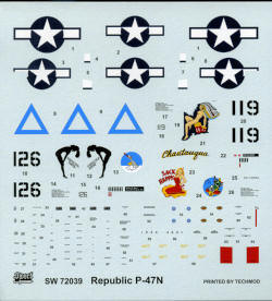 Instructions are very good with generic paint references for the build and FS 595 references for the color and markings diagram. The drawings for the build are superb, but there is a lot of info provided so it may seem a bit crowded. The instructions recommend interior green for the wells and I'm thinking it should be chromate yellow. Research will verify one or the other. Markings are for two yellow tailed planes from the 463rd FS/507th FG, one of which is shown on the box art. The other is a yellow and black striped 318 FG plane. These colors and stripes will have to be painted on by the modeler. All of them have rather large nose artwork, provided on the decal sheet. This is superbly printed by Techmod and includes a full data suite