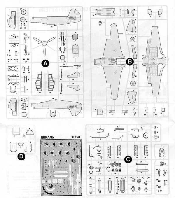 The interior on a Yak is pretty basic so it is not surprising that Zvezda is able to provide the builder with all the various bits and pieces. The only thing really missing is a seat harness. For the instrument panel there are decals should you so wish to use them. For the canopy open option, there is a separate rear section that has somewhat 'flatter' sides so that the canopy section will properly fit atop it. A great idea that still allows for fairly thick clear plastic parts. Other features are separate ailerons and a nicely done pilot figure, something that those doing an in-flight display will find useful.
