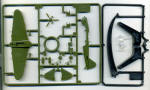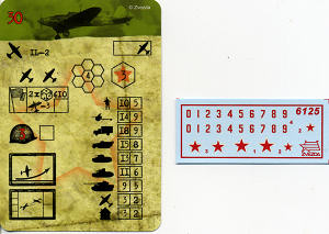 The kit instructions are quite basic but adequate for the intended purpose. There is no painting guide and to be honest, I've yet to see a combat IL-2 with insignia on the upper wing so take the markings guide with a grain of salt. The decal sheet is fairly well printed though the white outline to the stars is off register. A selection of tail numbers is the only unique marking for the model. A 'real' kit would have some nice patriotic slogans to add interest. The kit also comes with a game card which undoubtedly has some sort of move stats printed on both sides.