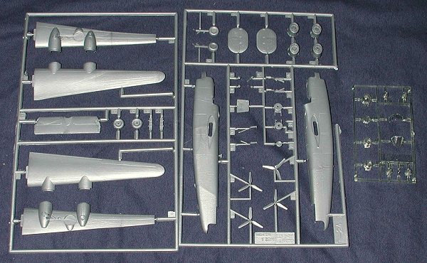 Here is yet another old Crown kit. However, unlike the B-29, this one is a bit better in the overall shape department. Panel lines are mostly raised and though there is a cockpit, it is only seats molded onto a flat base. No other interior or turret detail is provided. The kit can be built wheels up or down, and there are simple prop shafts if you want to pretend it is in flight. No stand is provided. A very nice touch is that the turrets can all be added at the final stage. That saves on any real problems masking. Considering the age of the kit, the parts are relatively flash free. This does not extend to the clear bits, however, and some cleanup will be needed prior to use.