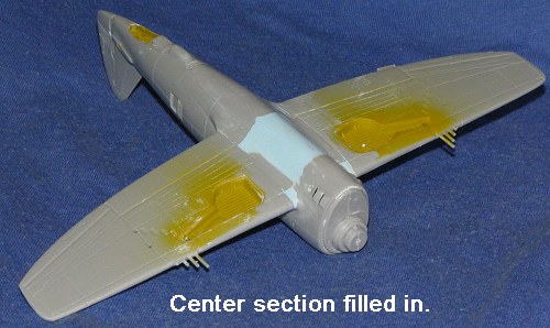 At this time I started to glue on the wing. Man, talk about a really lousy fit! I drug out the heavy sanding sticks and whaled away on the wing roots until it was possible to get the fuselage to fit. Even then, I glued only the upper wing roots, flooded them with glue, and taped the wings with an exaggerated dihedral in hopes they would dry in some position other than flat. I was rewarded with a semi decent dihedral, but the lower section was really hosed up. Once again, I broke out the big guns, inserting pieces of card in the larger gaps and slathering a mass of filler in the rest.
