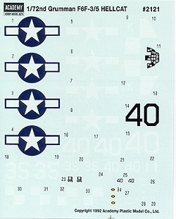The instruction sheet is more than adequate offering color information with each of the various construction steps. My copy is direct from Korea so much of this is in Korean, however it is not an insurmountable obstacle! There are two markings options provided. One is an F6F-3 in the tri-color scheme from VF-1 aboard the USS Yorktown. The other is an F6F-5 from VF-17 aboard the USS Hornet and in an overall gloss sea blue color. Academy's decals are quite gloss and generally work rather well. Not sure exactly how opaque the white parts are so it may be a good idea to have an aftermarket sheet for a backup if so needed.