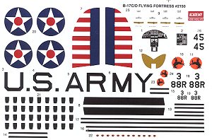 Instructions are quite good giving the usual construction steps and offering painting information where it is needed. No FS or ANA colors are given, only generic colors. The decals are for two aircraft, both of them in overall natural metal. One is the box art B-17C of Colin Kelly who was killed when his aircraft was set upon by Japanese fighters after an attack on a minesweeper in early 1942. It is singularly unremarkable in markings other than the aircraft number on the fin. The other is a B-17D of the 436 BG at March Field in 1941. This aircraft has the front of the engine cowlings in yellow and black. The black bits are supplied as decals. The sheet itself is well printed and should work OK. I've never had any real problems with Academy decals, but they don't seem to be quite as easy to work with as aftermarket ones. As far as finding aftermarket decals, good luck as I don't know of any.