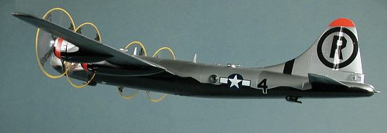 The masking was removed and the decals then applied. I used Mike Grant's new B-29 sheet to do the black bottomed 313 BW plane. I chose this scheme for two reasons. One was that I like the black underside. The other is that it didn't have any de-icer boots so I wouldn't have to mess with masking these items!. These decals are done on an ALPS and like other Mike Grant work, are just superbly printed. They are also rather susceptible to scratches so care needs to be taken when working with them. After cutting them out of as much of the carrier as possible, they went down just great. These are quite thin and I only used the very mild Microscale setting solution on them. The large Circle R on the tail shows just how short the kit fin really is! These
