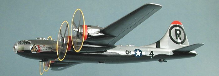 Back at the wings, the seams were also puttied where needed. Biggest area of concern were the engine nacelles. One side fit well, the other needed filler. While that was drying, the engines were painted flat black. You are given a forward and second row and frankly, they are a bit small in diameter for the real things, but give the proper illusion and that is the best one can expect. The engines were painted black and drybrushed to bring out detail. The engines fit quite well onto the wings and then the wings were glued to the fuselage. Fit here is also rather good, though I did need some filler.