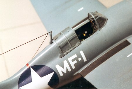 Since the wing slots through the fuselage, I did not cut out the lower windows in the fuselage, representing them with decal instead. Once the interior was painted and detailed, the wing was installed and the fuselage glued together. I kept the kit engine and propeller. Then the canopy was trashed and Squadron/Falcon replacement item substituted. These canopies are great and you get two so you can mess one up. They also allow the now fully detailed interior to be shown. Yes, I did use Reheat instrument decals. With the aircraft nearly complete, I put a set of oil coolers made from large tubing under the wings as this minor item was omitted by Monogram. It was then painted a mid blue-grey upper and light grey lower using Testors and Gunze paints. The landing gear was then installed and True Details wheels replaced the toy ones provided. Final touches included a set of Superscale decals for an appropriate Marine ace, antenna rigging, engine exhausts robbed from the Hobbycraft P-36, and the addition of guns in the wings. The guns were made from stainless steel tubing imbedded in contrail tubing that matched the gun openings. Once these are installed, the gun barrels realistically 'float' in their openings.